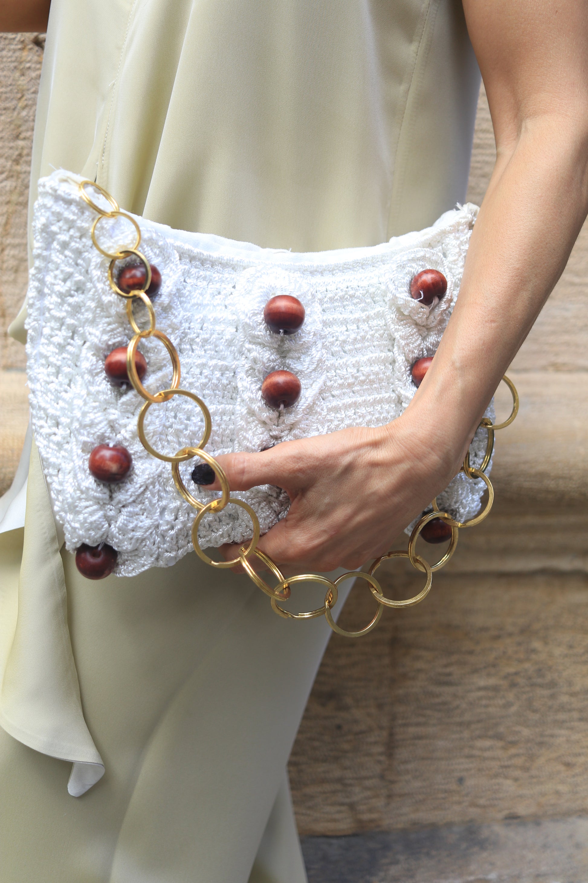 Contact us on WhatsAppHandmade white crochet bag with African wood balls and a gold chain