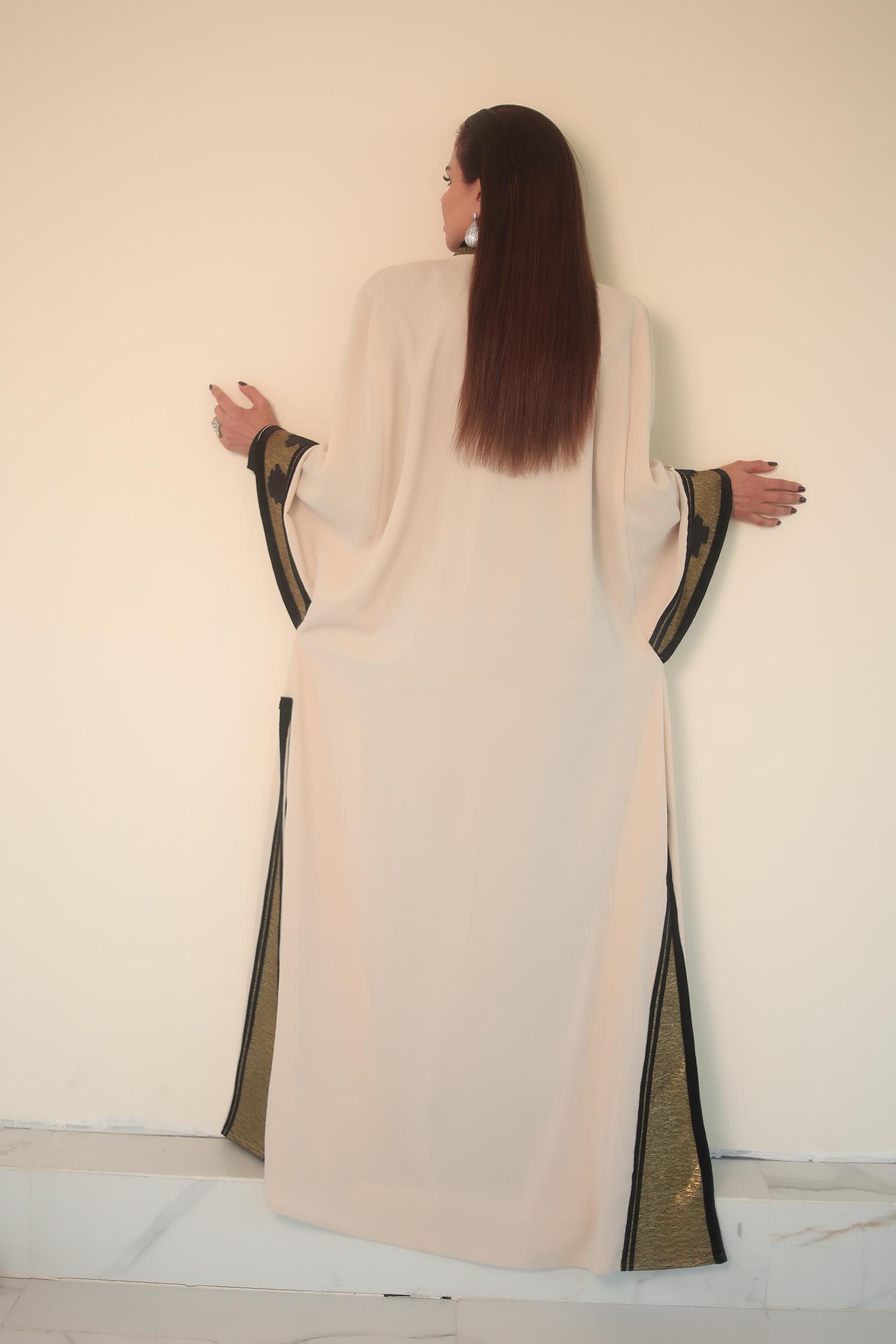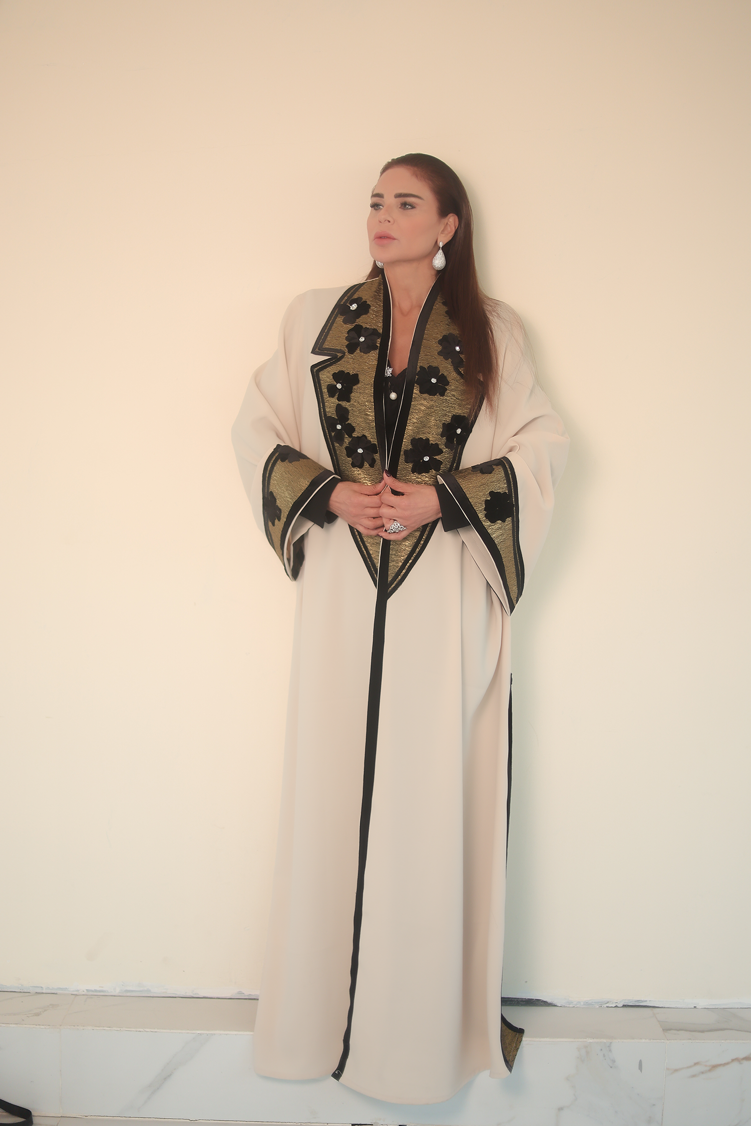 Contact us on WhatsAppCrafted from double crepe, this elegant beige abaya features laminated fabric on the neck and sleeves, velour floral embroidery, and Swarovski stone embellishments. A perfect blend of timeless sophistication and luxury,