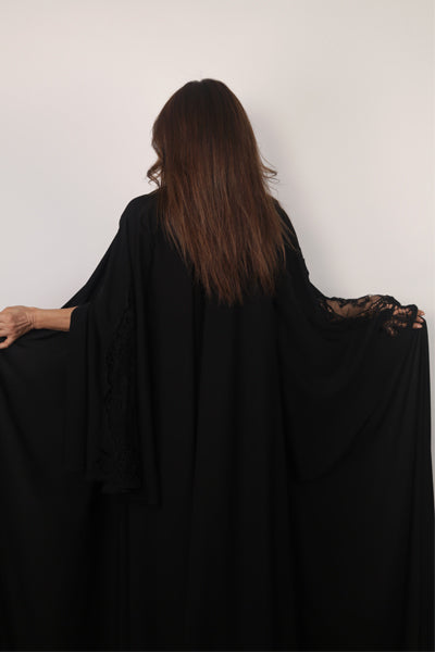 Contact us on WhatsAppThe black crepe abaya is a timeless and elegant piece, crafted from high-quality crepe fabric that drapes gracefully. The addition of black dentelle (lace) enhances its allure, offering a delicate and sophisticated touch to the design.This abaya combines simplicity with intricate detailing, making it a versatile and stylish choice for various occasions.