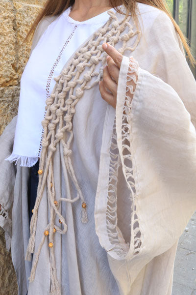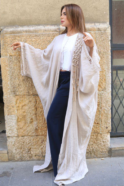 Contact us on WhatsAppThe Abaya Beige is an elegant garment made of pure lennon cotton fabric. It is adorned with intricate crochet embroidery and wood mini balls. It offers a stylish and sophisticated choice for those seeking a unique abaya.