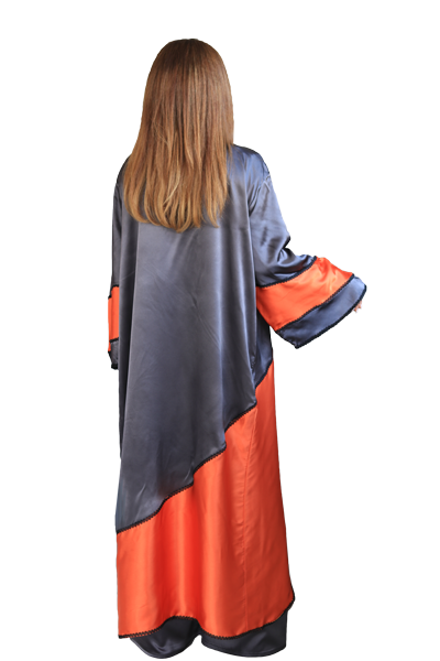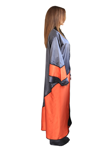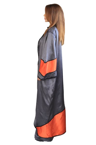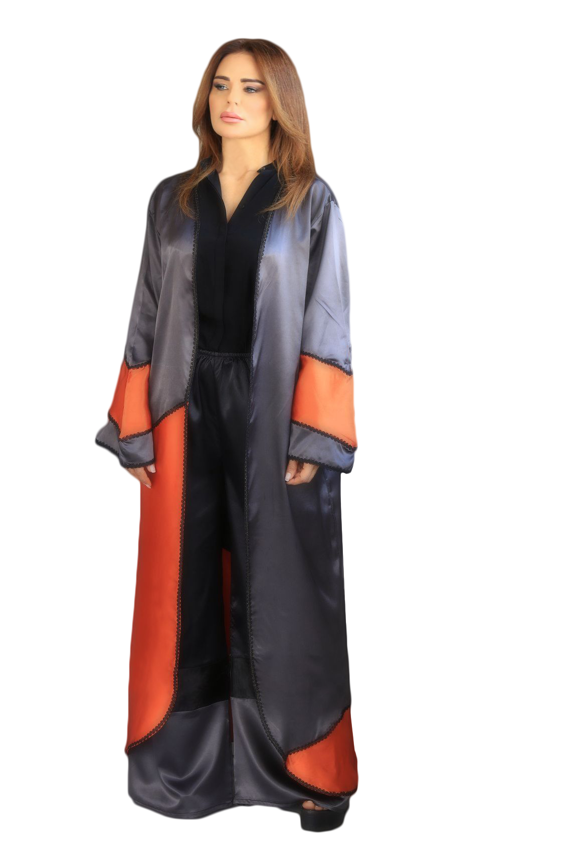 This exquisite Abaya is a true masterpiece, featuring a gorgeous blend of smoked satin fabric that exudes sophistication and elegance. The intricate embroidery adds a touch of glamour and luxury, making it a perfect choice for any formal occasion. The bold orange and the mouse grey color creates a stunning contrast that will turn heads and leave a lasting impression.
