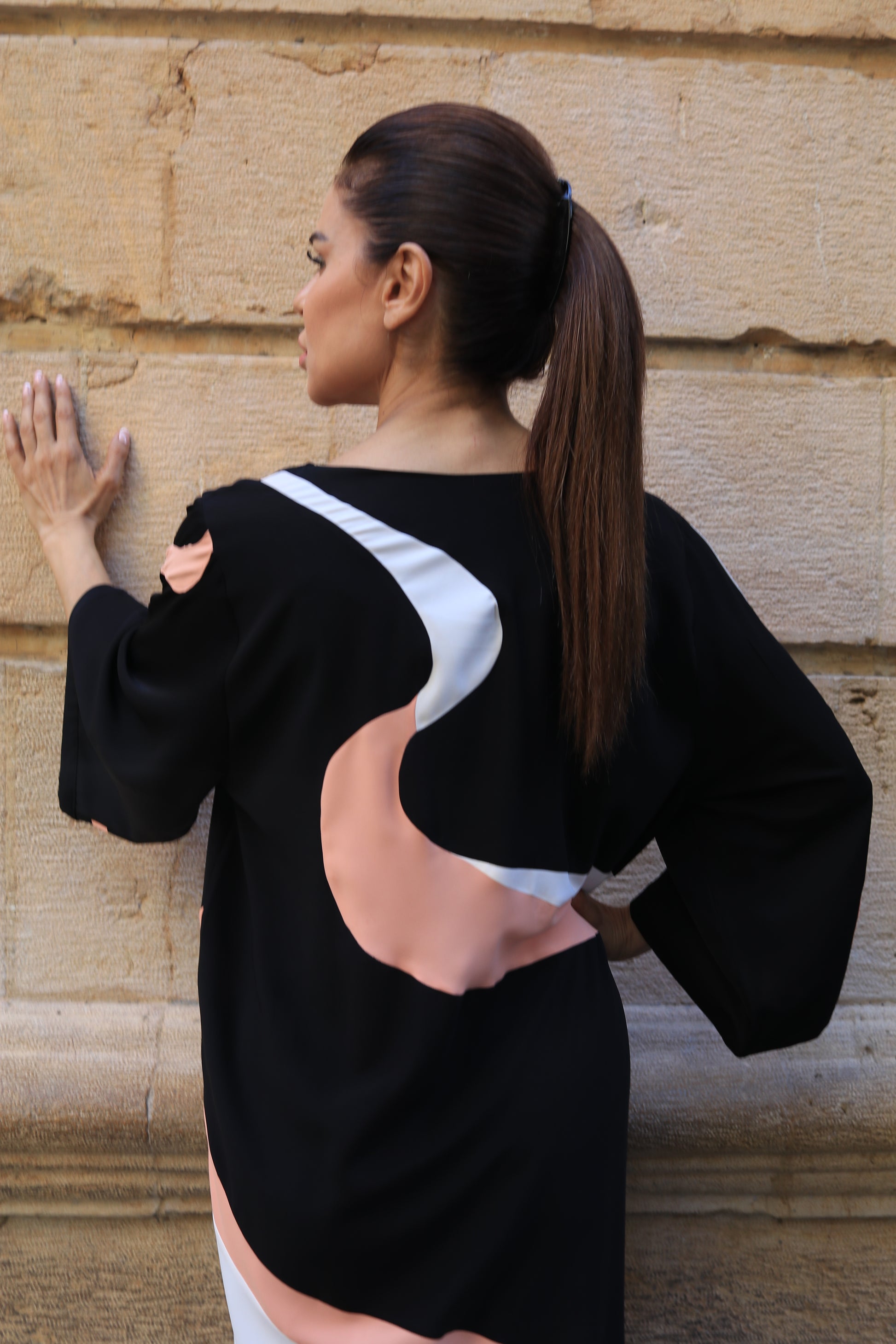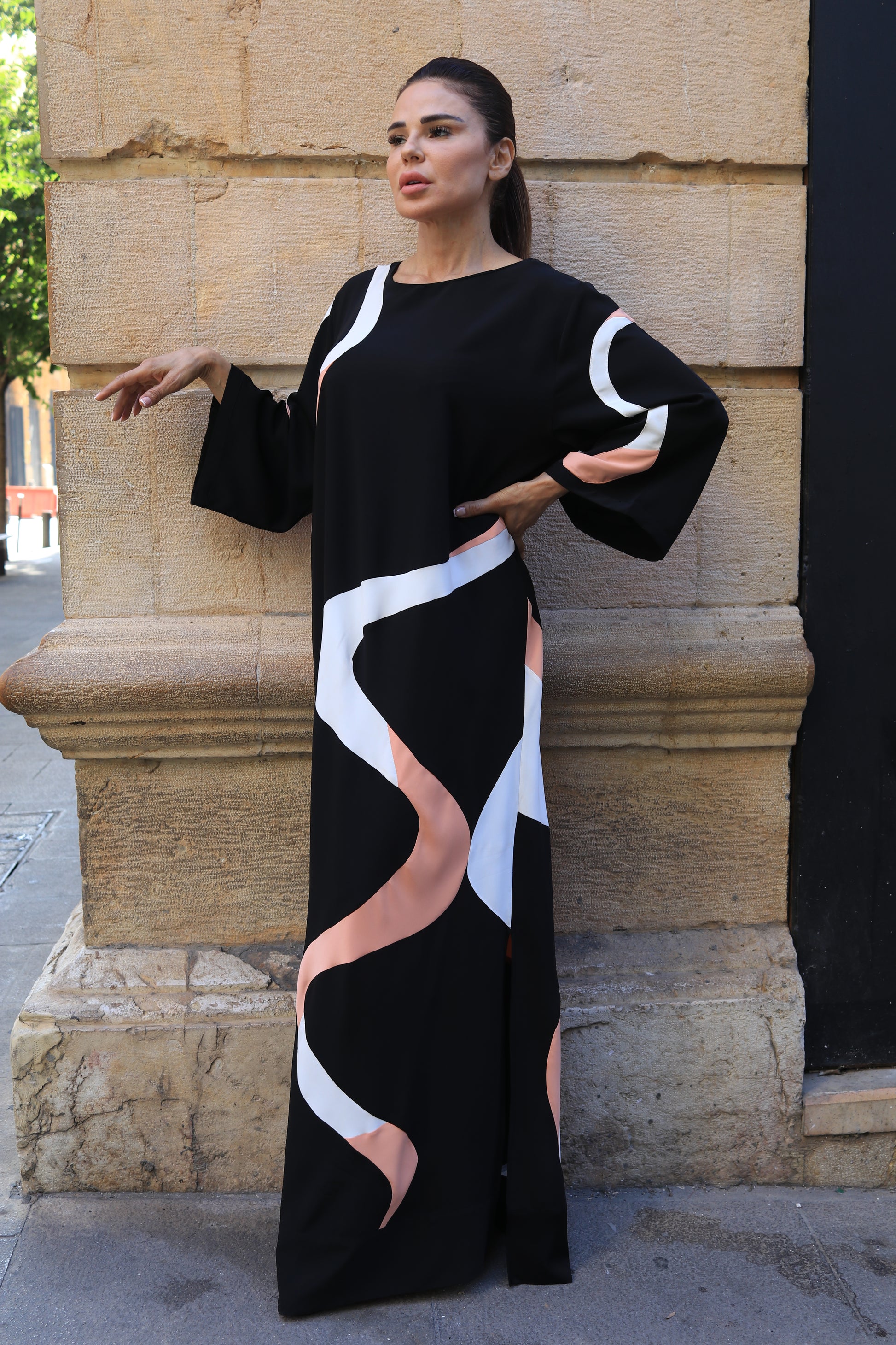 Contact us on WhatsAppA black snake dress abaya with delicate salmon and white embroidery patterns. Made from crepe fabric, it offers a comfortable and stylish fit. It combines modern fashion with cultural elegance, perfect for various occasions.